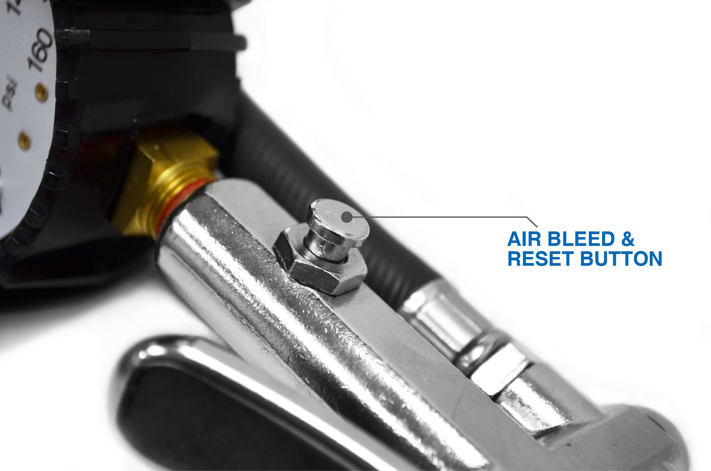 - Pressure bleed valve button releases pressure from the tire to your desired range or clears display after checking pressure with dual chuck.