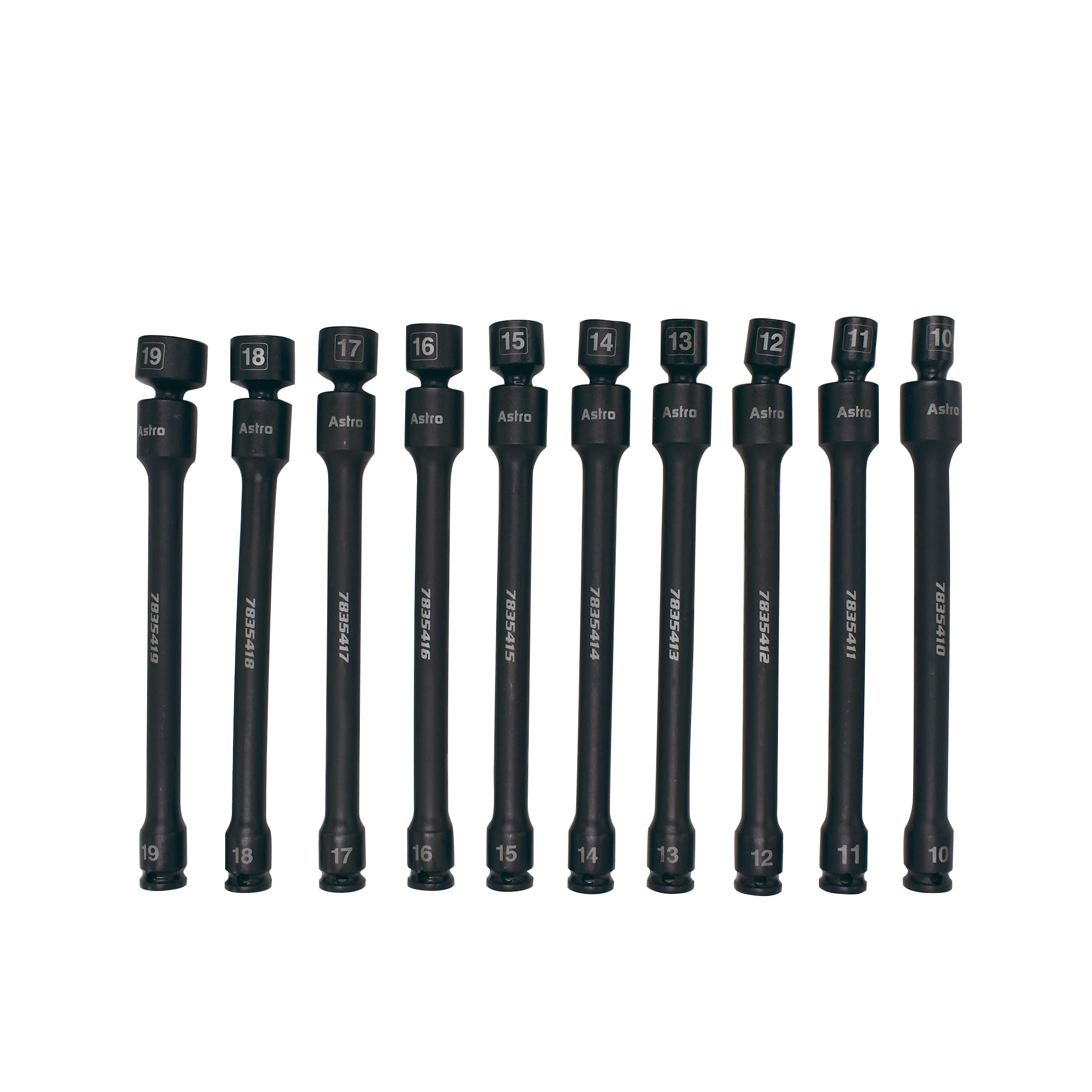 - No-skip set from 10mm to 19mm, 9” long 3/8” drive 6-point pinless impact universal extension sockets